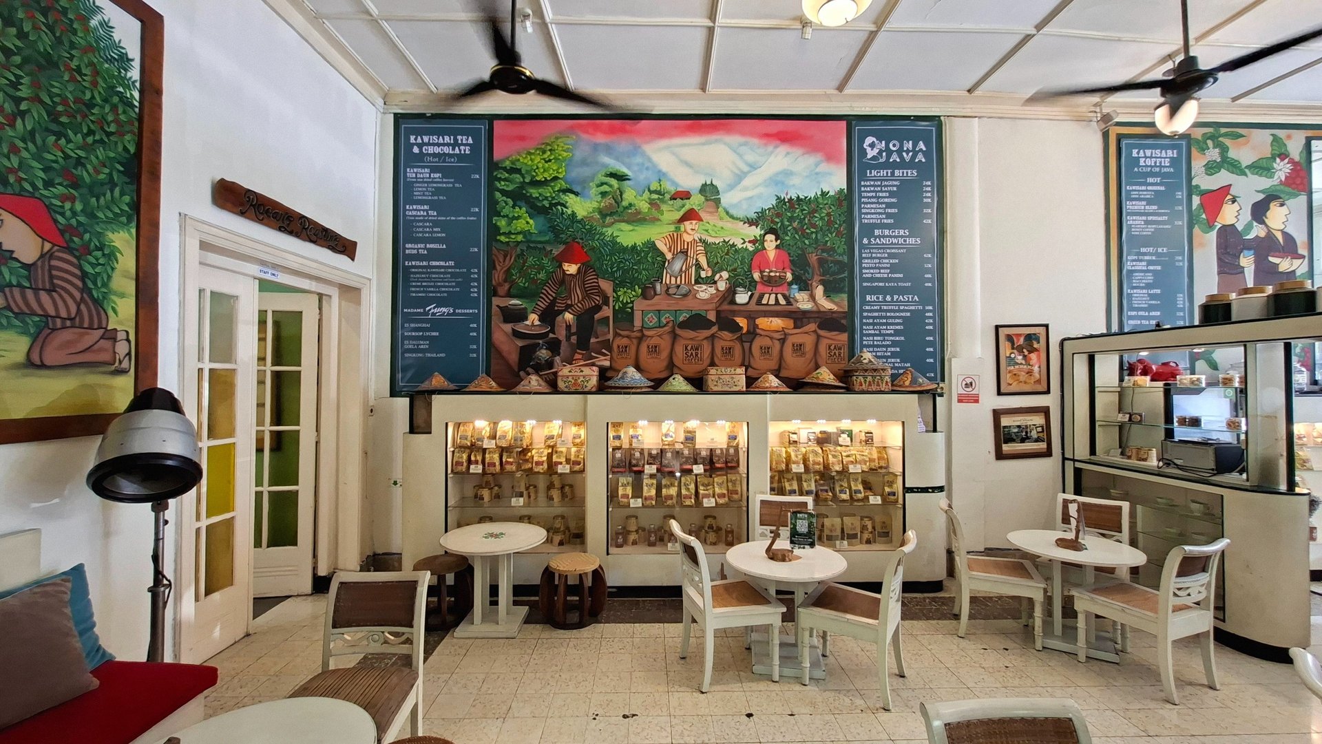 I like the way they keep the architectural elements original. They even reuse the furniture from the original salon. Looking inside an old display cabinet, I found several types of coffee beans—for example, this premium Java Robusta, which is roasted traditionally with wood instead of gas.