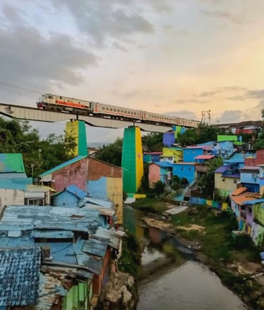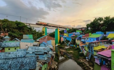 The railway over the Colorful Village is a busy route to Malang Station and a great spot for photos! The train passes the railway bridge at the following times: