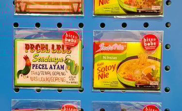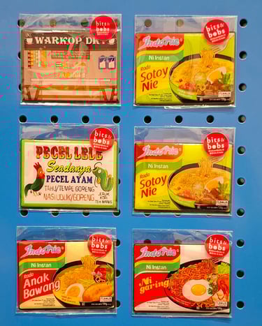 One of my favorites is Bits & Bobs by Angela Kurniawan who makes really cool items inspired by everyday Indonesian life, like Warteg or Indomie illustrations, and I love how she uses humor and a minimalist design to showcase local culture.
